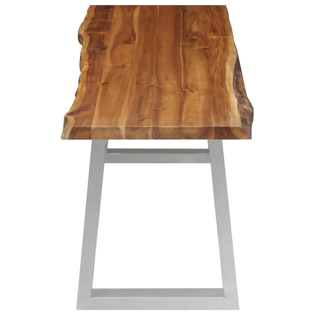 Aus massivem Akazienholz gefertigt, ist die Tischplatte äußerst stabil. Die lebendige Kante des Holzes, die der natürlichen Form des Baumes folgt, unterstreicht die Schönheit der Bank. Zusätzlich tragen die Beine aus Edelstahl zum industriellen Stil bei und verleihen der Bank eine hohe Stabilität.
