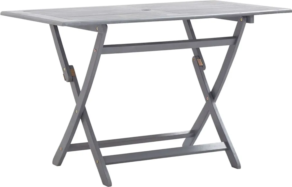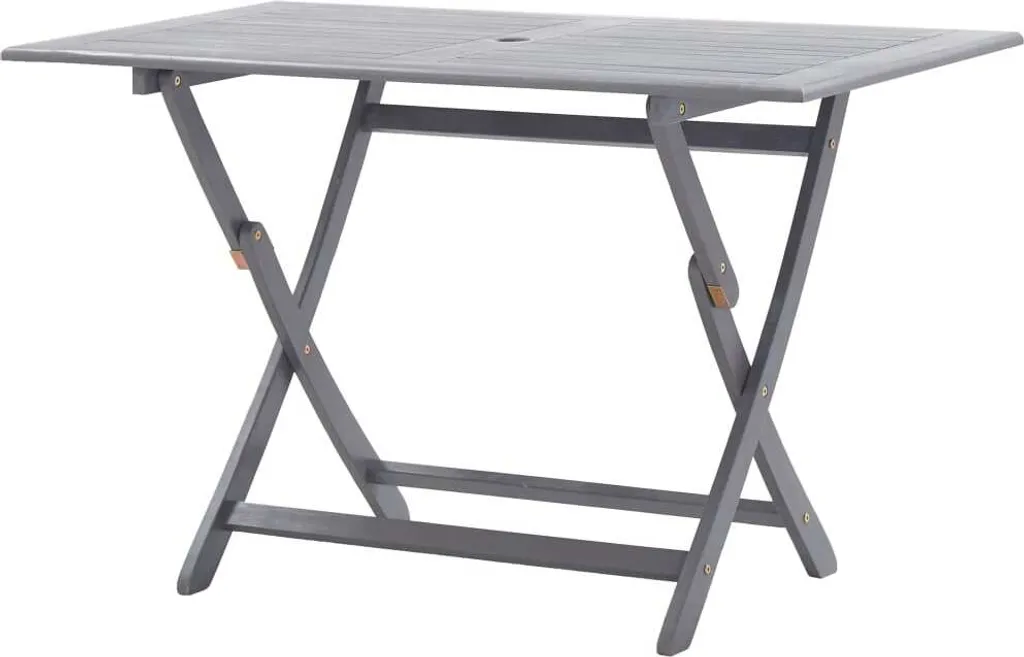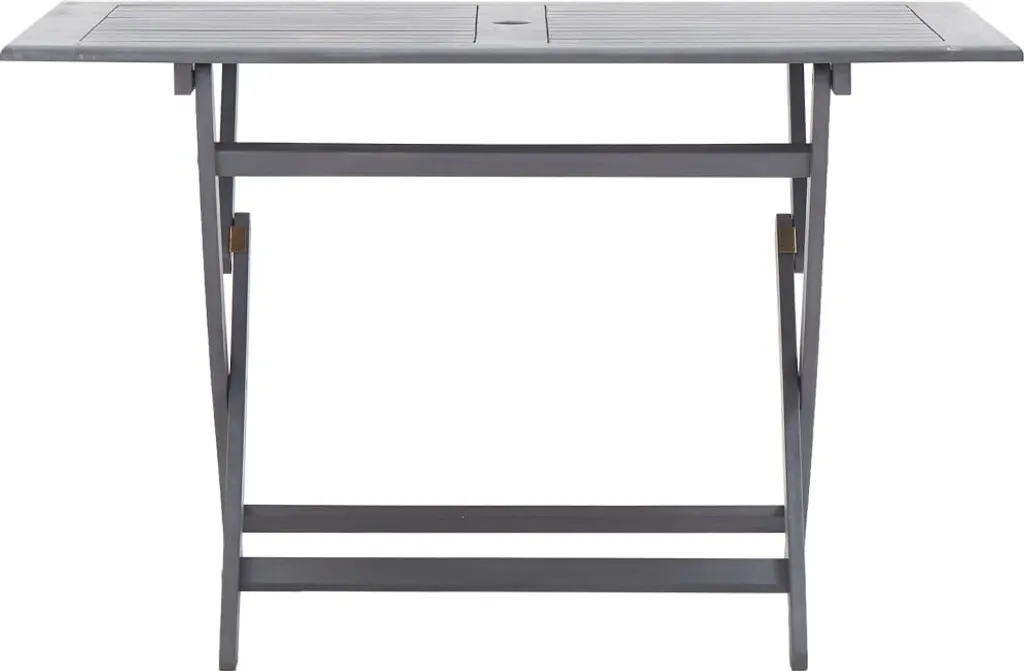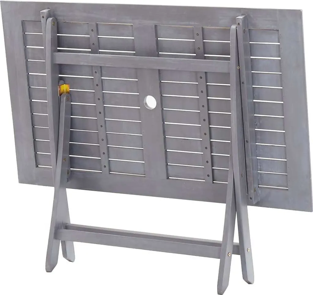Der Garten-Esstisch besteht aus massivem Akazienholz, einem tropischen Hartholz, das witterungsbeständig und äußerst langlebig ist. In der Mitte befindet sich ein Loch, das Platz für einen Sonnenschirm bietet. Der Gartentisch kann bei Nichtgebrauch platzsparend zusammengeklappt werden. Der Esstisch muss montiert werden.